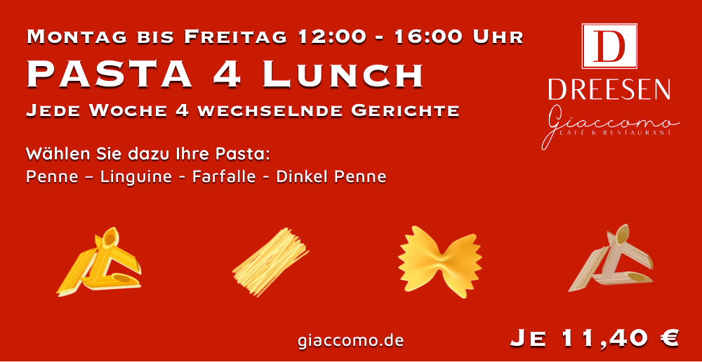 „Pasta4Lunch“, der Name ist bei uns im Giaccomo von montags bis freitags, 12 bis 16 Uhr, Programm.