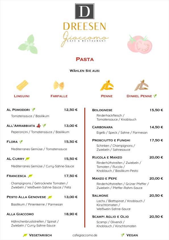 Das Giaccomo ist frisch, das Giaccomo ist saisonal, wir sind auch vegetarisch und vegan. Wir kochen mediterran, ja ein bisschen italienisch, so wie es halt im Giaccomo „immer war“. Leckere Pfännchen, die Pasta zum Nudelgericht zur Wahl, viele Kleinigkeiten und selbstverständlich wechselnde und saisonale Angebote.